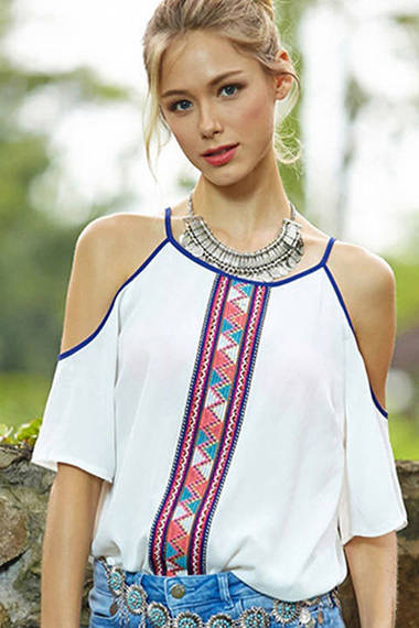 Блуза белого цвета натонких бретельках с открытыми плечами. Спереди украшена геометрическиморнаментом. Изготовлена из тонкого легкого материала.