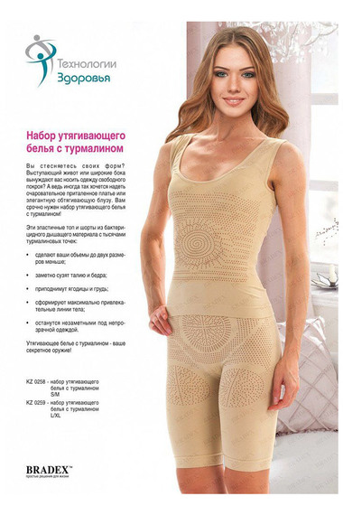 Набор утягивающего белья с турмалином одевается на нижнее белье под одежду. Шорты и майку можно носить как одновременно, так и по отдельности. Для сохранения согревающего эффекта био-керамических турмалиновых частиц, не рекомендуется машинная стирка, замачивание и использование агрессивных моющих средств.